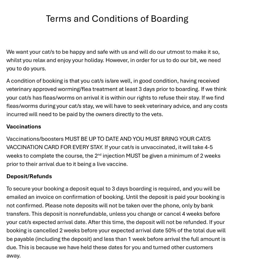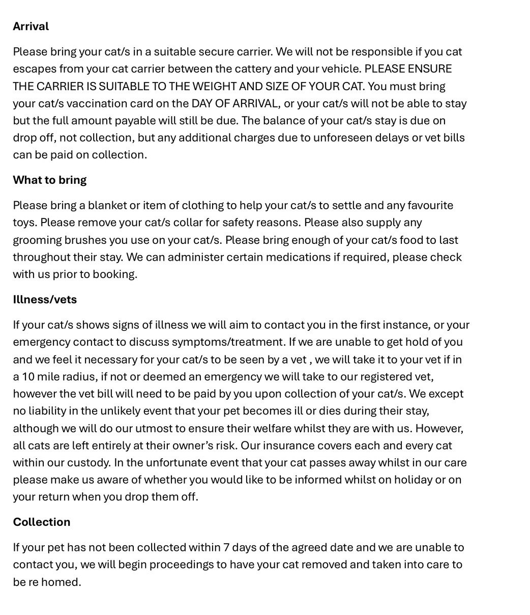 Nestled in a quiet town , our cattery offers a peaceful retreat for your cat’s stay.